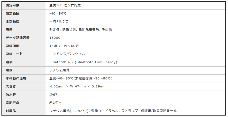 Bluetooth対応の温度データロガーです。 スマートフォン/タブレット用アプリで機器設定・データ吸い上げ、グラフ表示などが可能です。 提供しているスマートフォン/タブレット用アプリは、設定・グラフ表示可能な「T&D Thermo」、指定した期間のPDFレポートを作成する事に特化した「TR4 Report」の2つです。 収集したデータは無料クラウドサービス「おんどとり Web Storage」へ送信され、ブラウザから確認することができます。クラウドに送信したデータはPCで解析することもできます。 -40〜80℃の温度測定に。IP67 防浸形