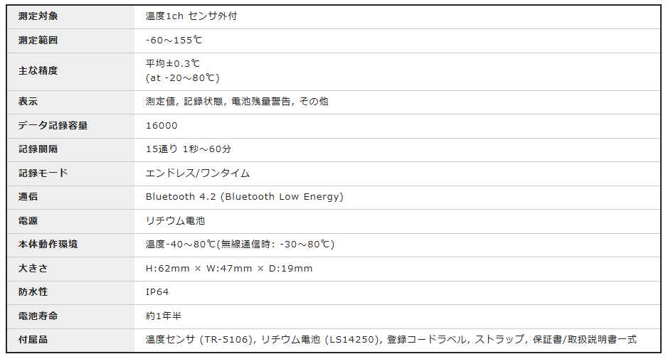 TR42A Bluetooth対応 温度データロガー (センサ外付け温度1ch 長さ 約60cm) 株式会社ティアンドデイ
